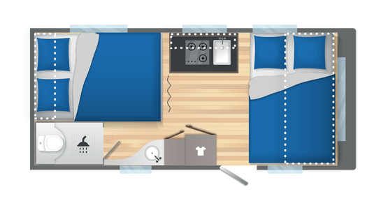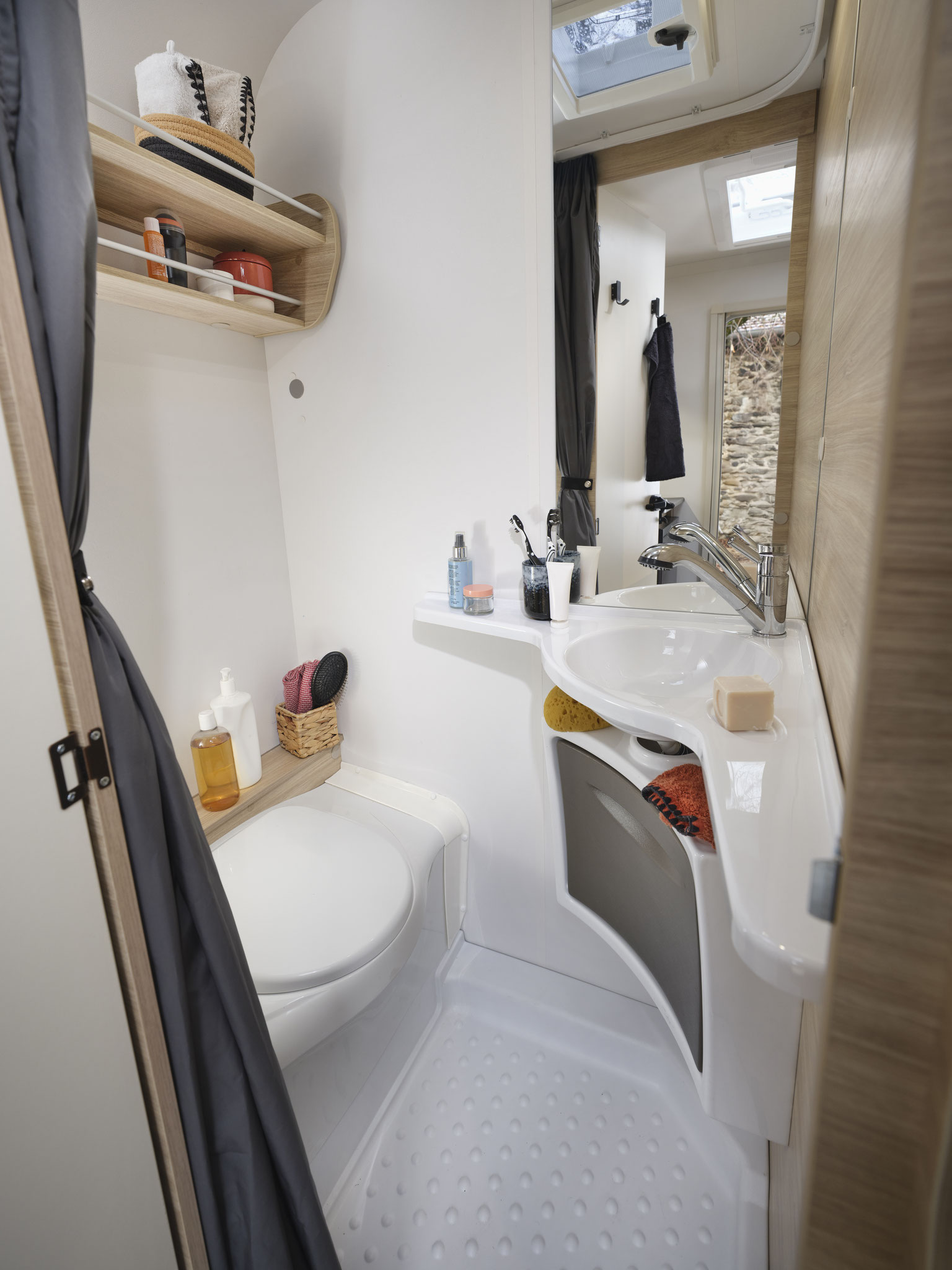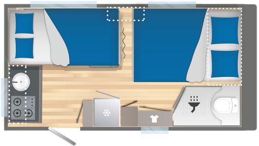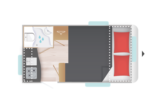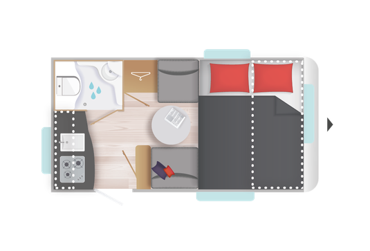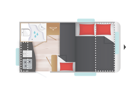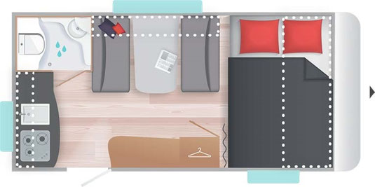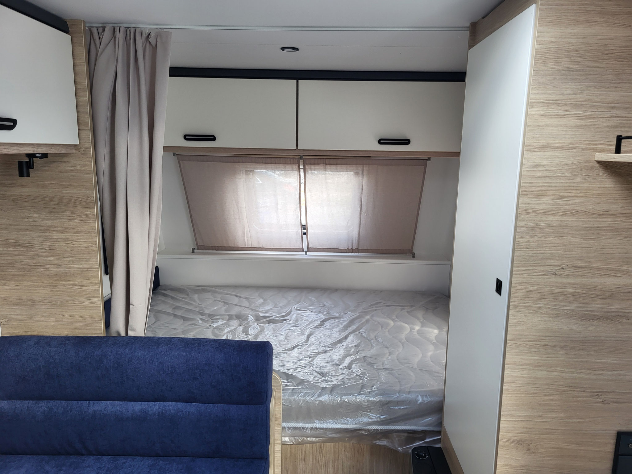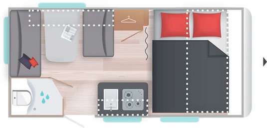 Dieser kompakte, leicht zu manövrierende Wohnwagen hat die Wette gewonnen: auf 4 Metern ein Festbett 140 cm breit und ein großer Dinette-Bereich für 3 Personen. Außerdem bietet er einen zweiten Schlafplatz 120 cm breit, also 3-4 Schlafplätze.