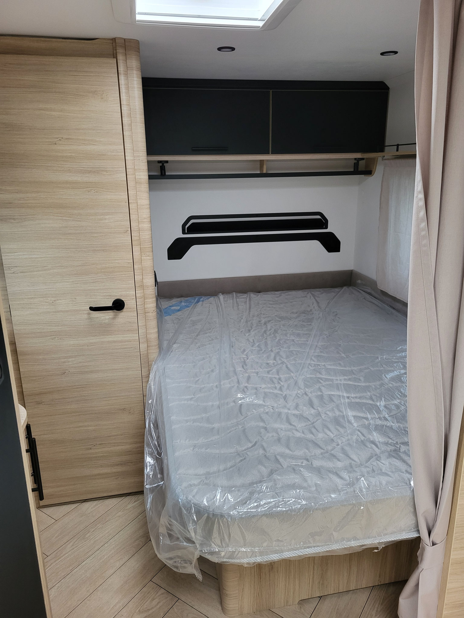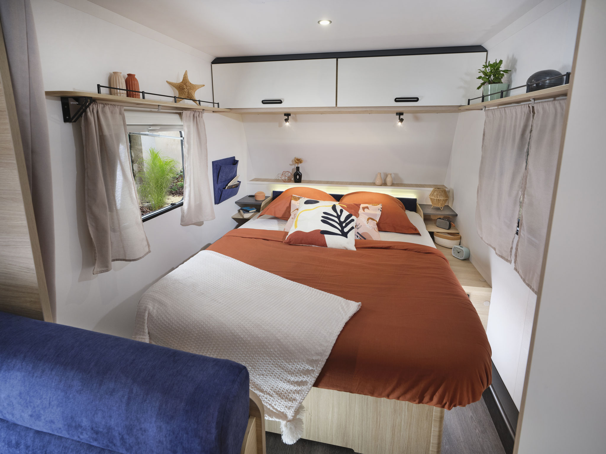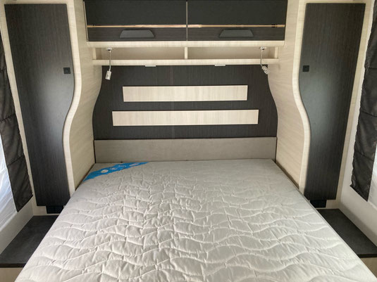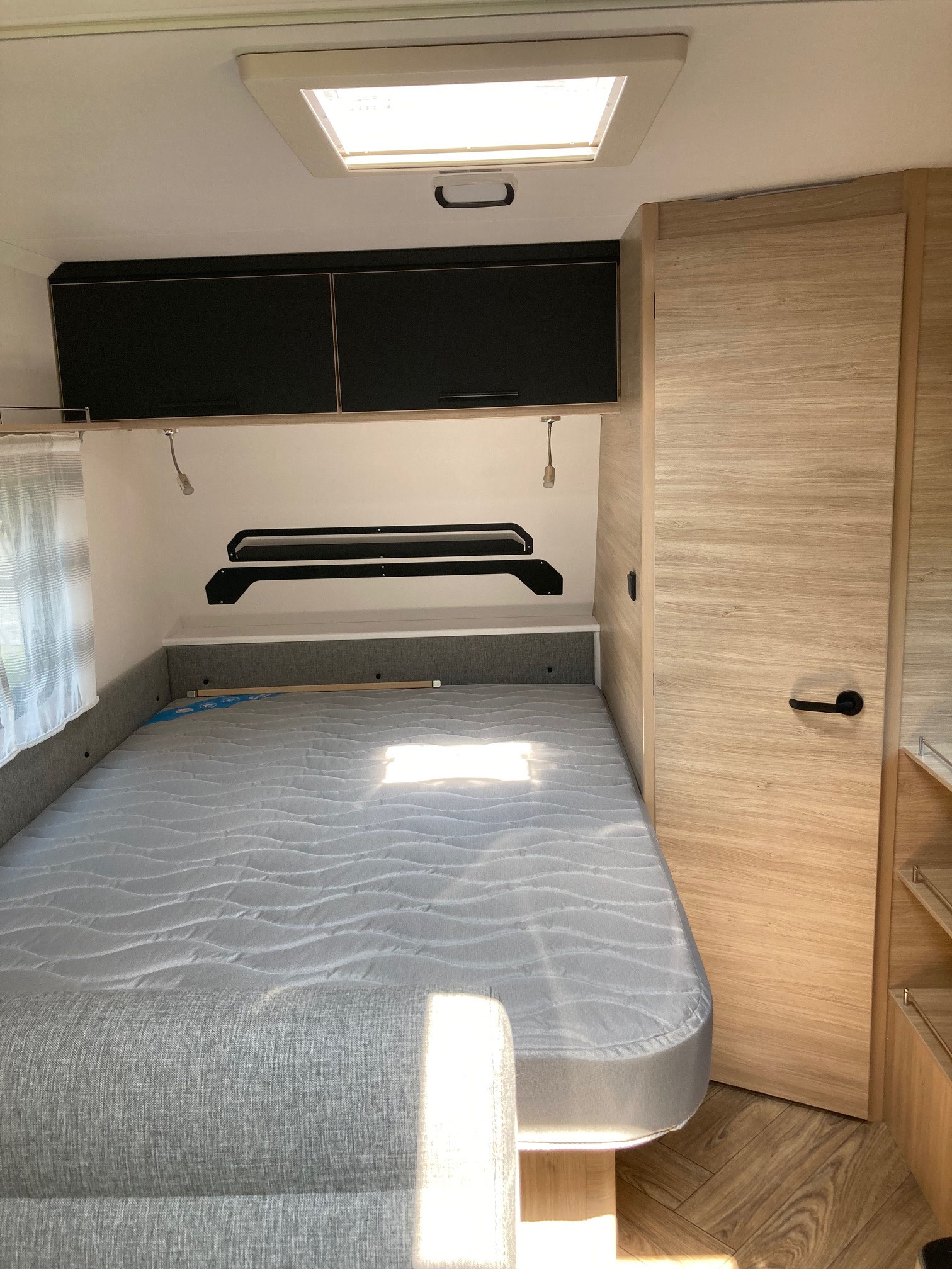 Dieser Wohnwagen bietet viel Platz, Komfort und Stauräume. Das zentrale Bett mit einer Breite von 1,5 m und einer Länge von 1,95 m ist komfortabel und leicht zugänglich; ferner verfügen Sie über