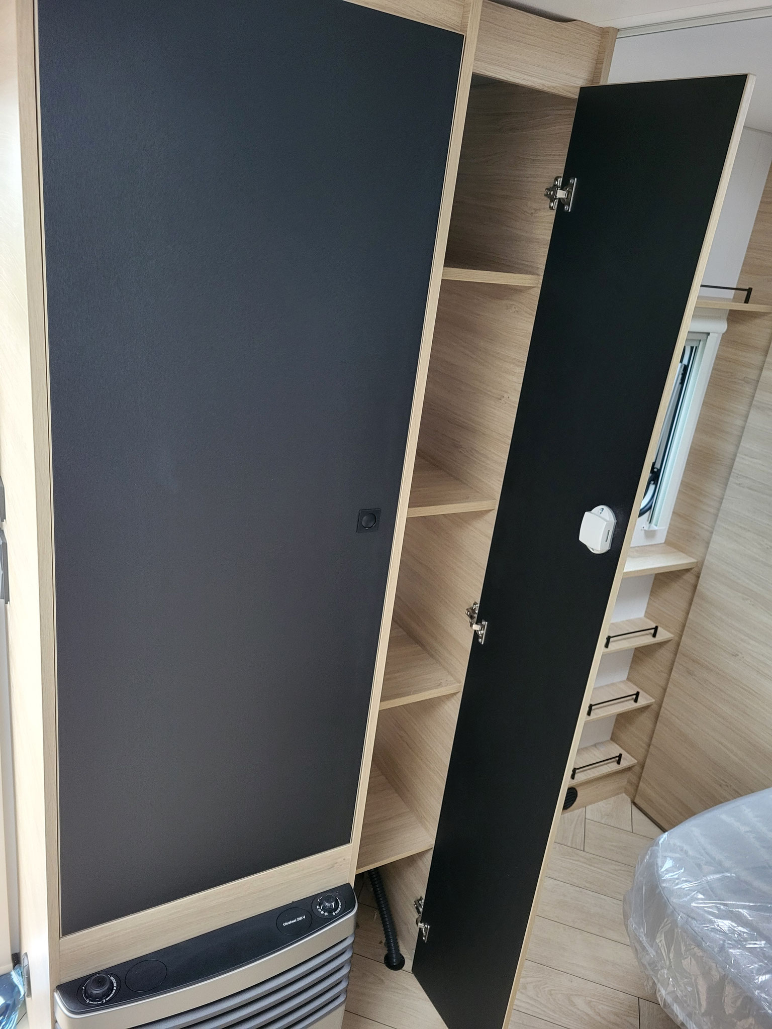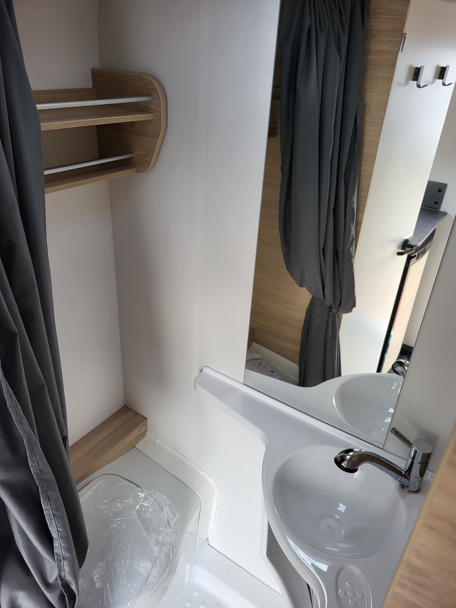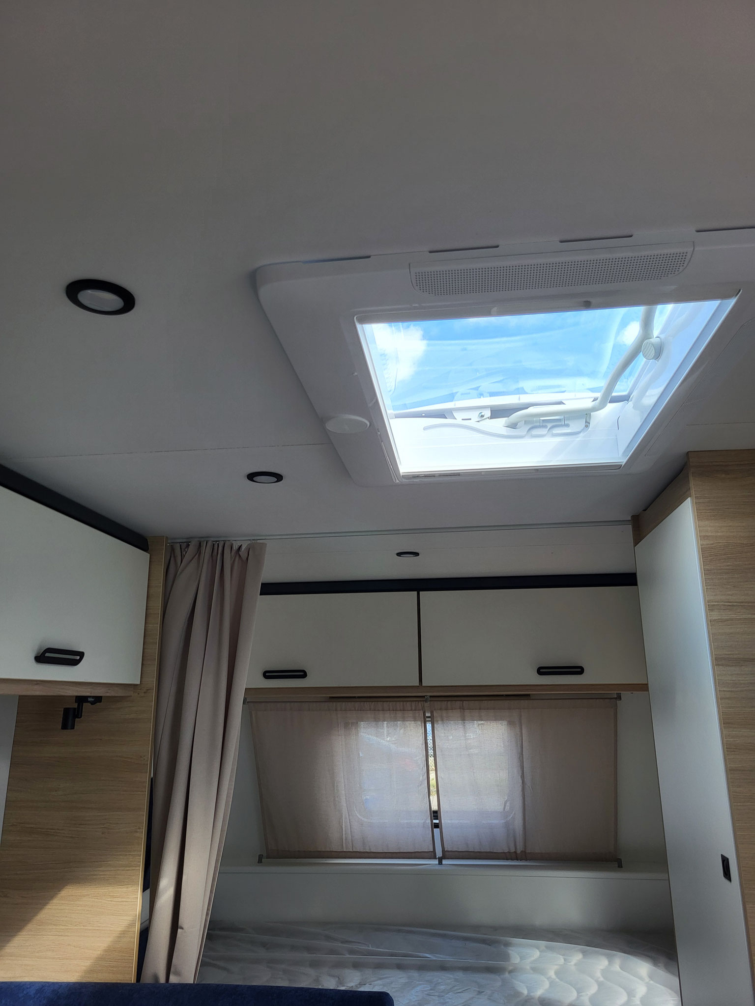 Dieser Wohnwagen bietet viel Platz, Komfort und Stauräume. Das zentrale Bett mit einer Breite von 1,5 m und einer Länge von 1,95 m ist komfortabel und leicht zugänglich; ferner verfügen Sie über