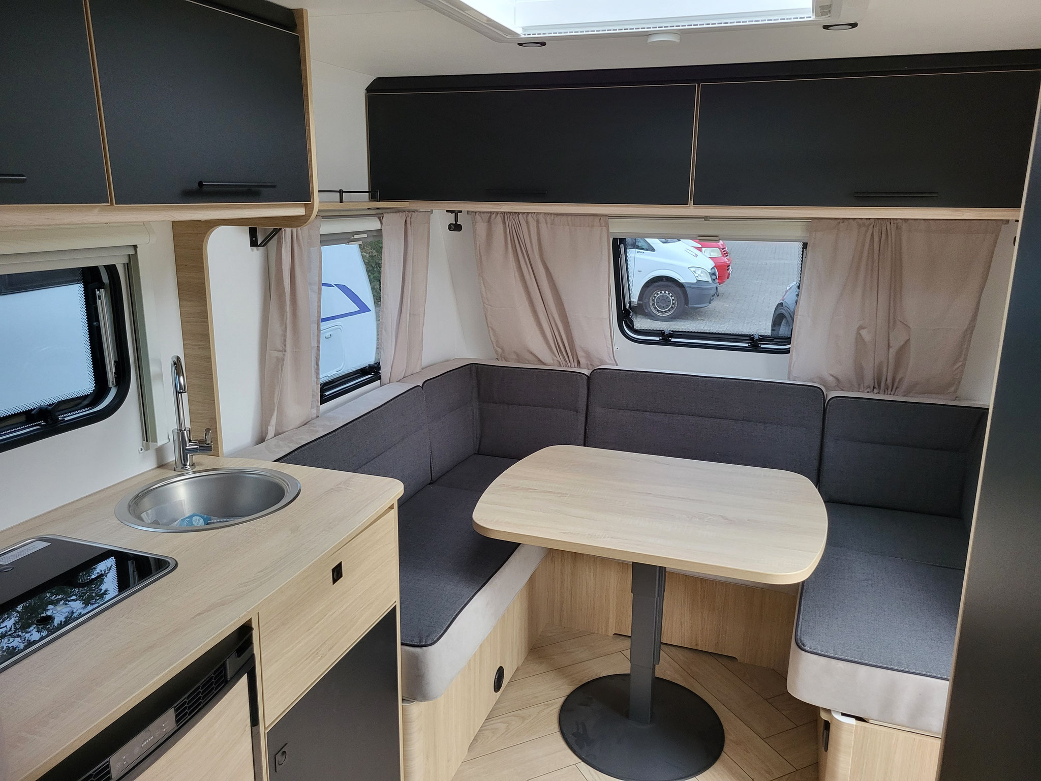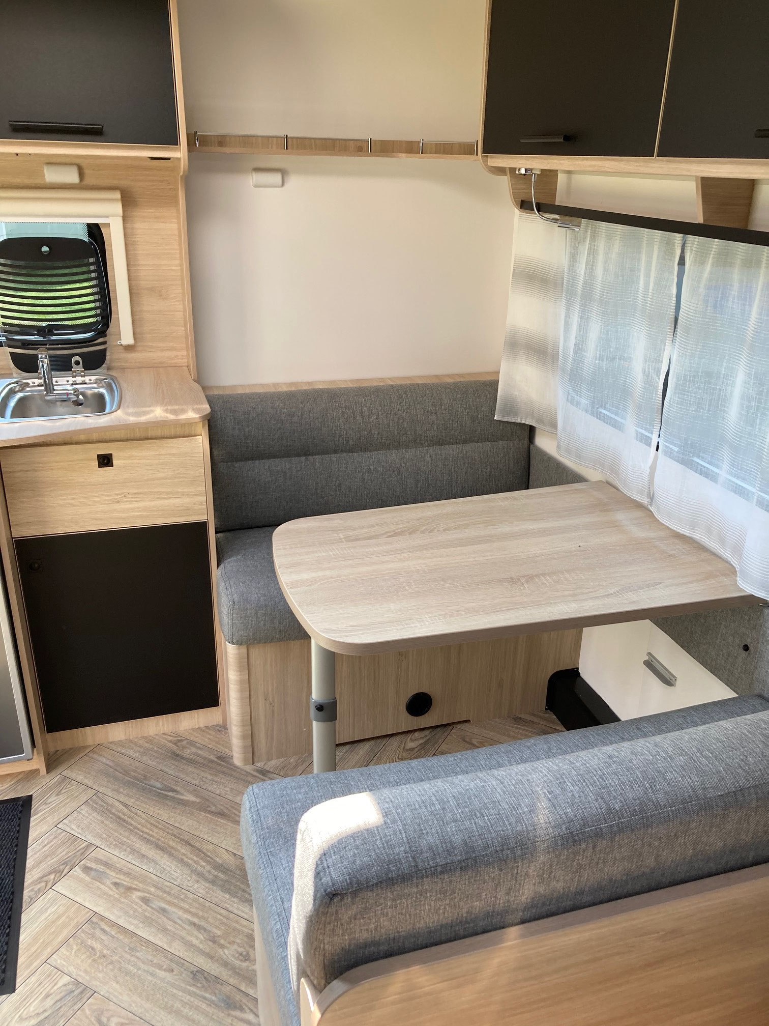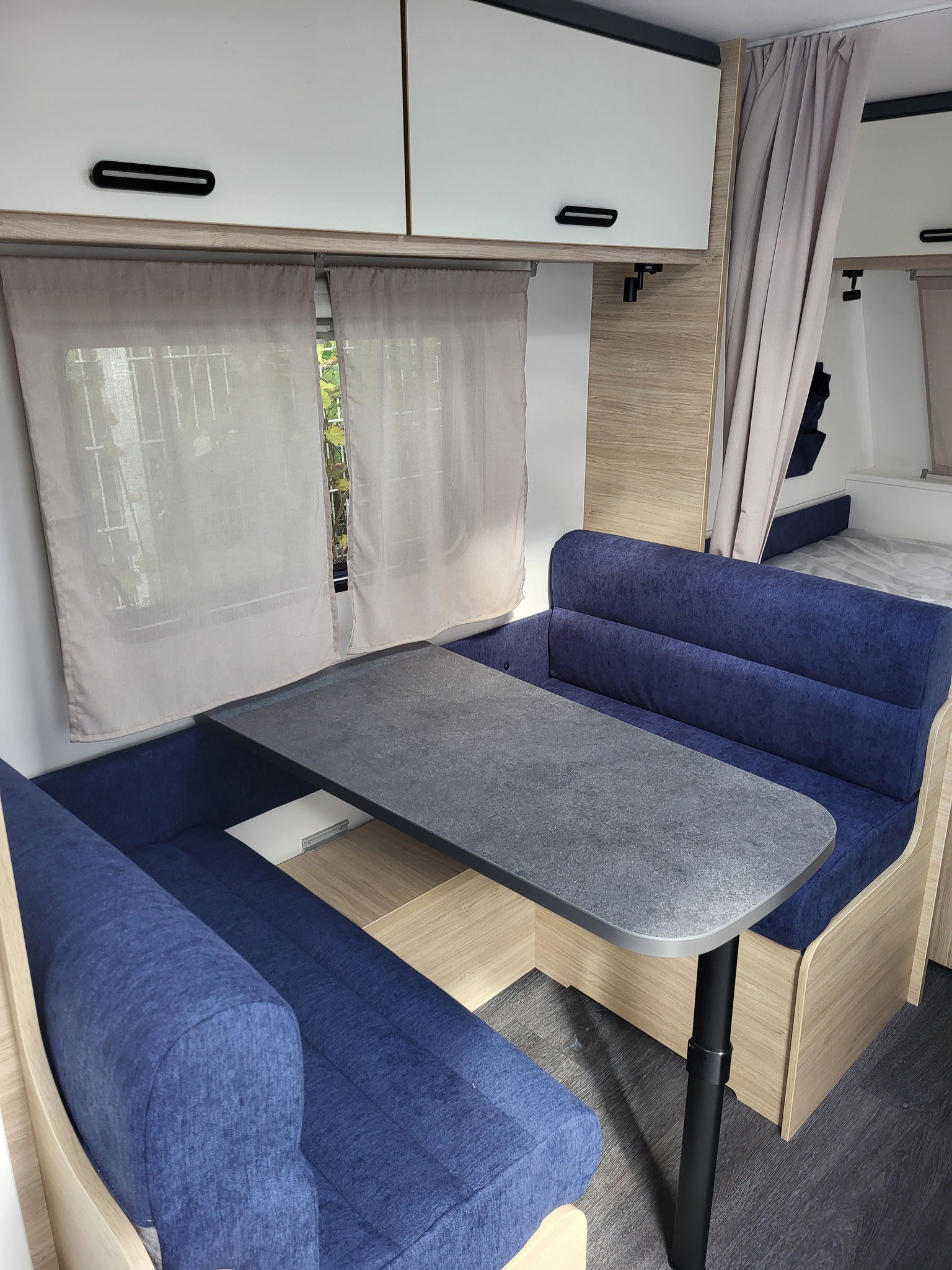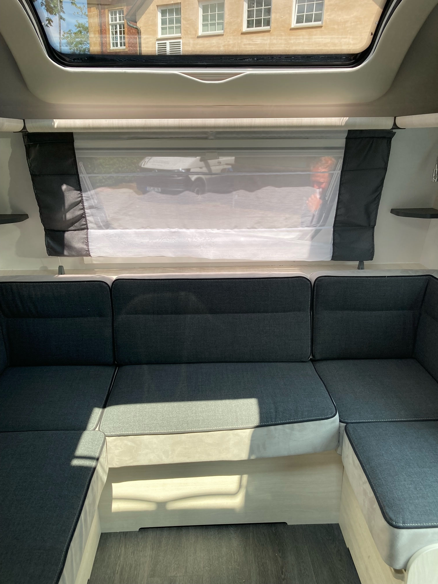 Ein Wohnwagen mit einer Rundsitzgruppe im Bug, keine abgeschrägten Matratzen und einem Kompressor Kühlschrank, mehr benötig man nicht für einen gemütlichen Wohnwagen.