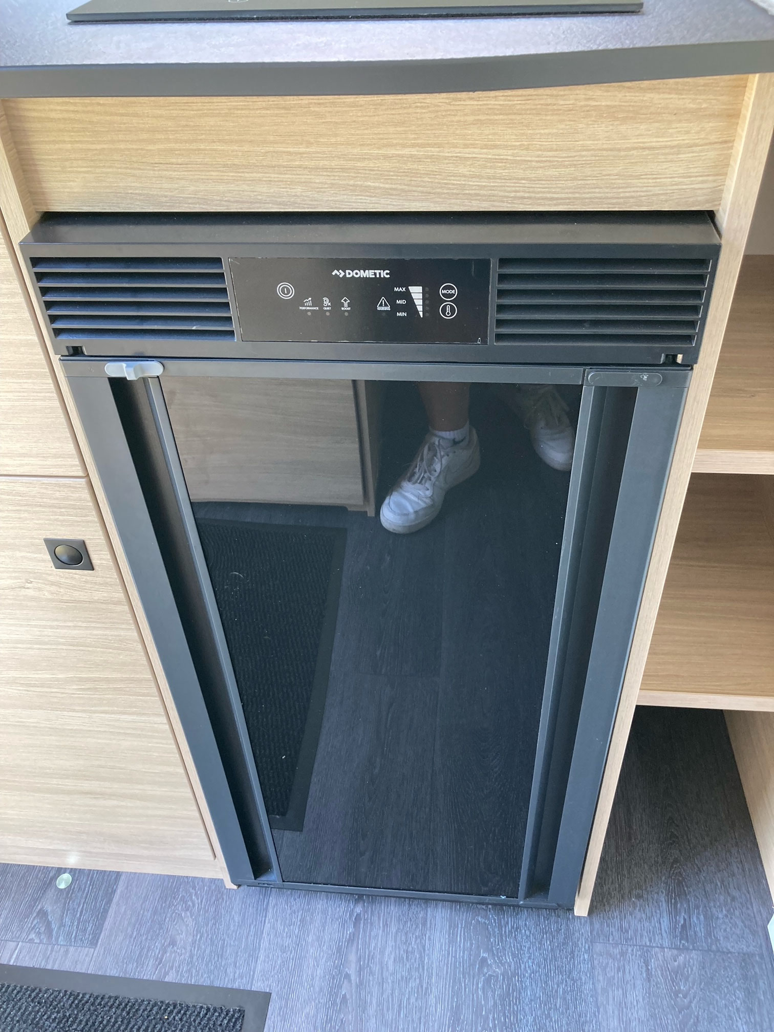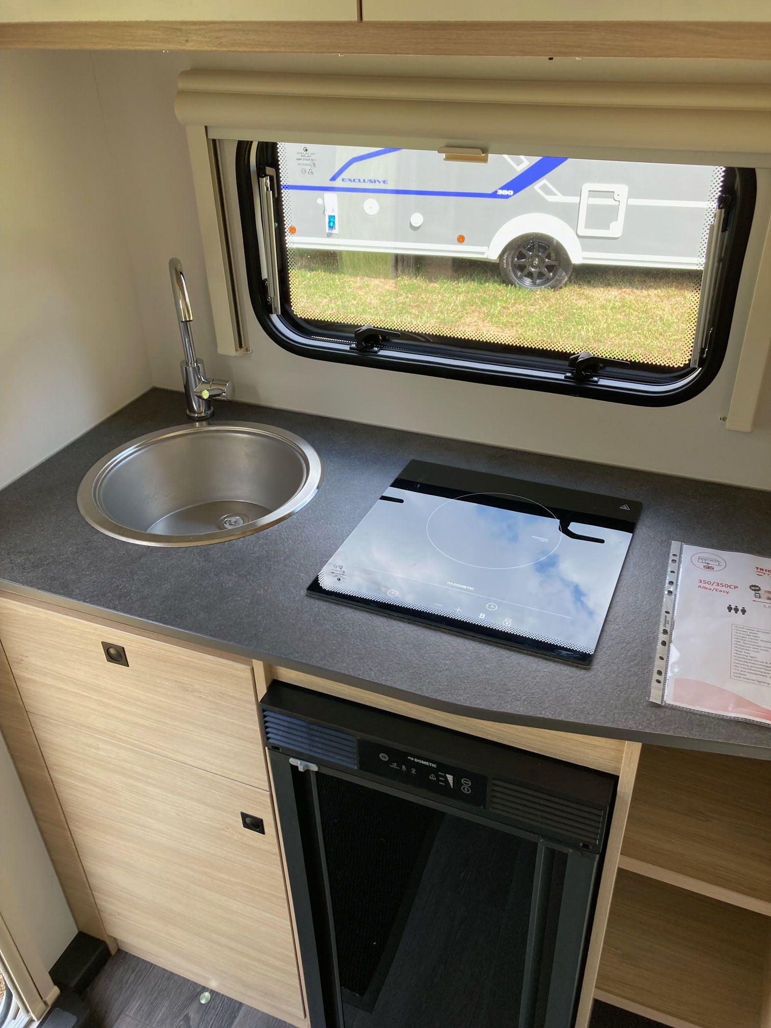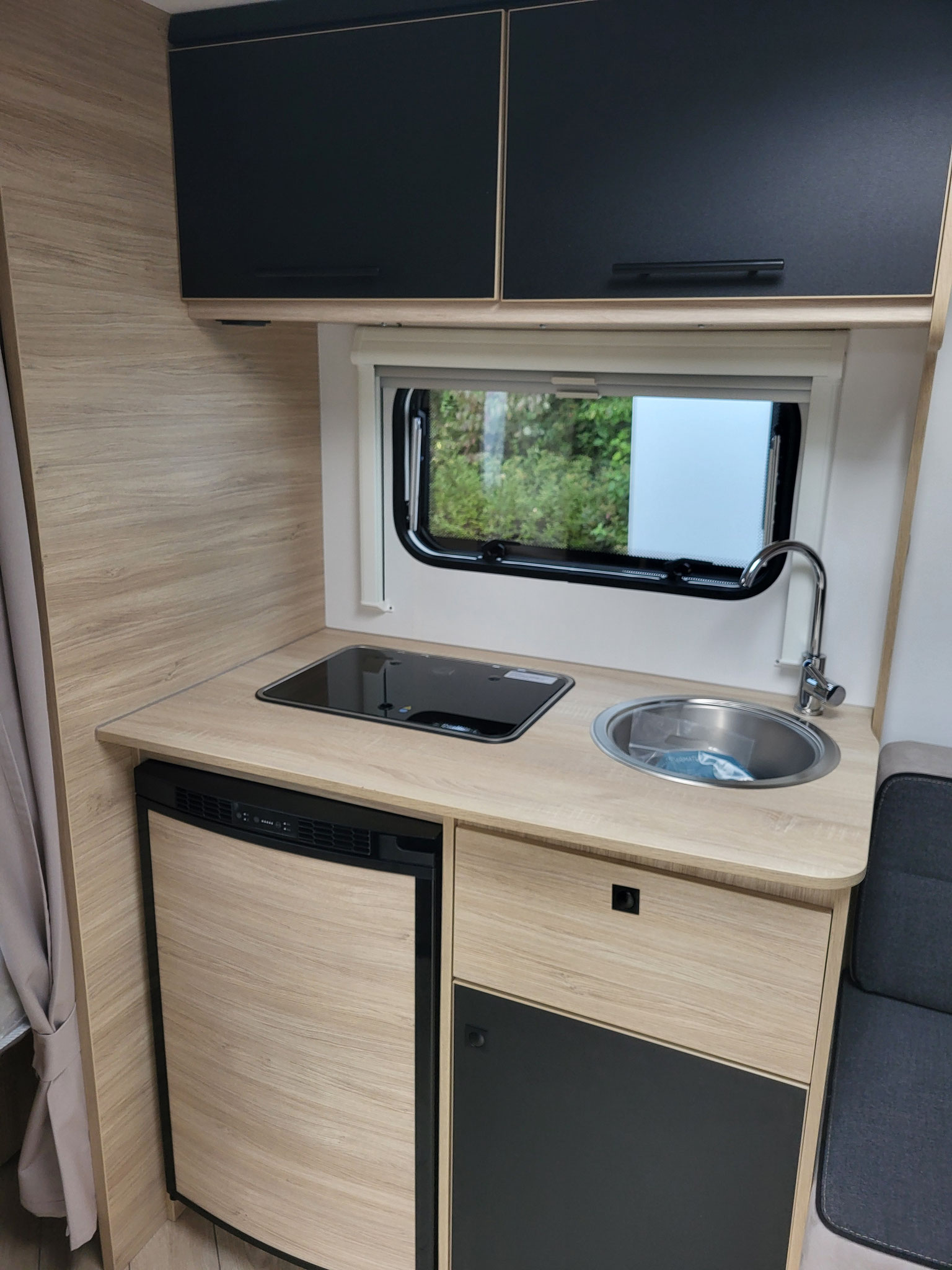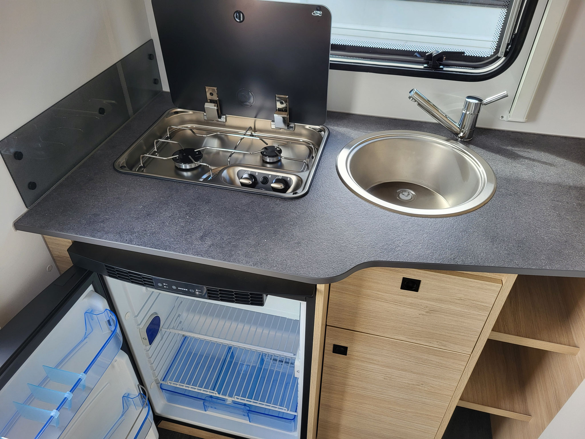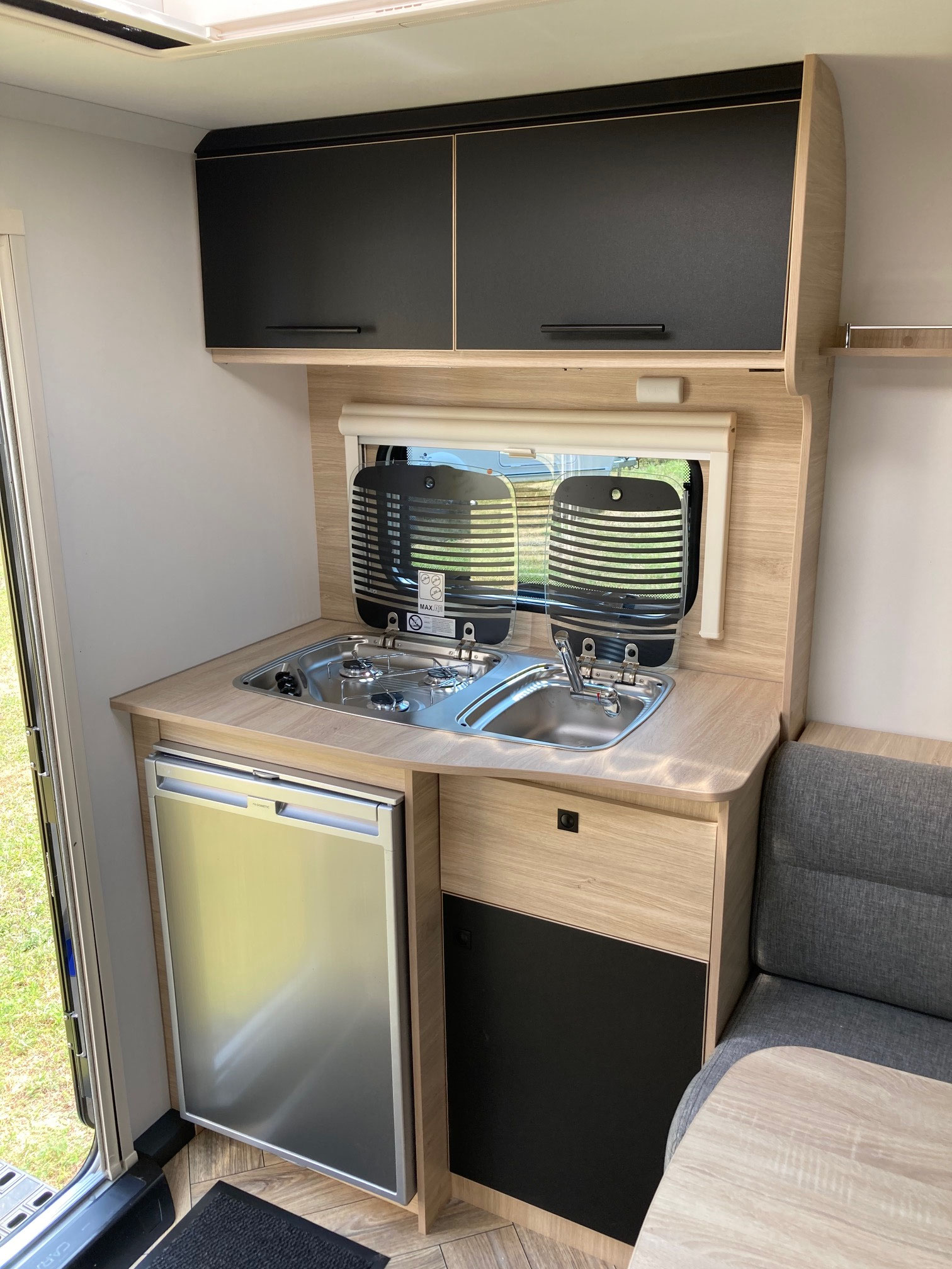 Ein Wohnwagen mit einer Rundsitzgruppe im Bug, keine abgeschrägten Matratzen und einem Kompressor Kühlschrank, mehr benötig man nicht für einen gemütlichen Wohnwagen.