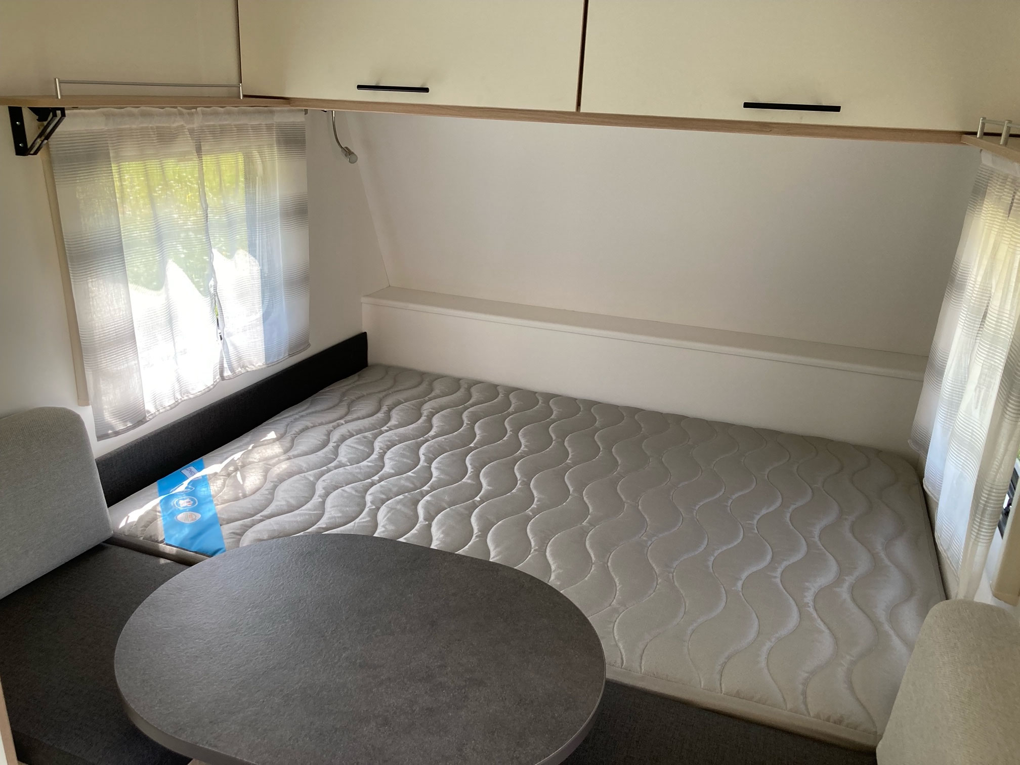 die Wette gewonnen: auf 3,50 Metern ein Festbett 140 cm breit mit Dinette-Sitzgruppe anschleißend mit 3 Varianten zum Schlafen.