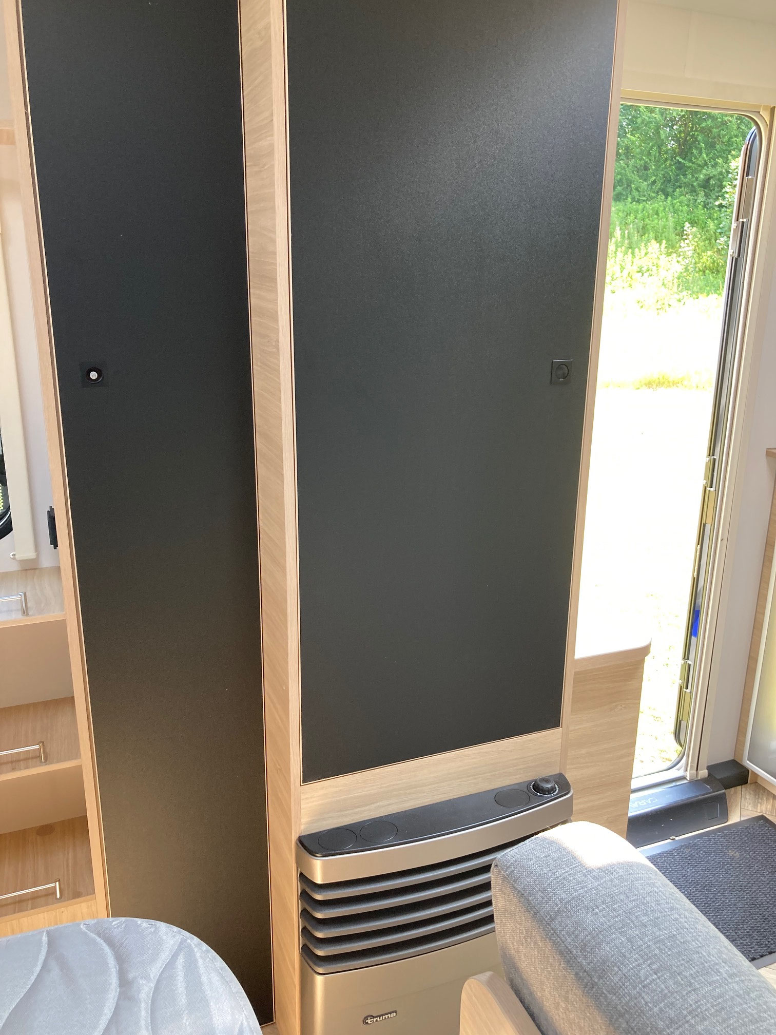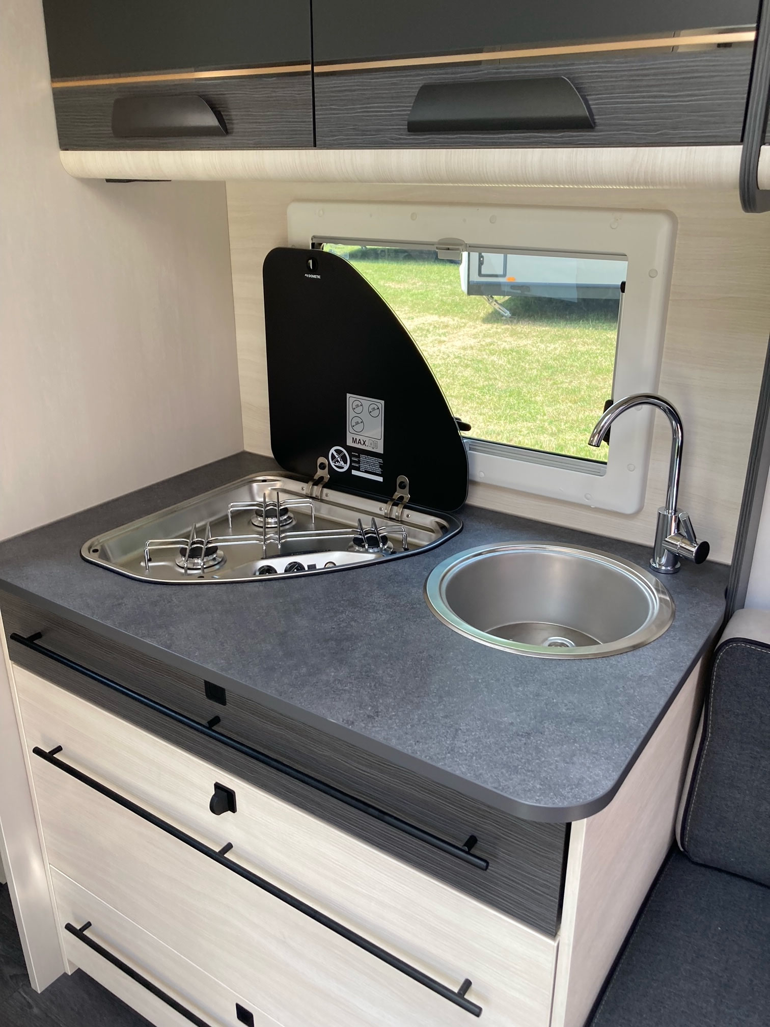 in ein Bett umwandeln lässt. Zur Serienausstattung gehören ein 150 l Kühlschrank, eine Gasheizung über Warmluft und ein Fahrradträger.