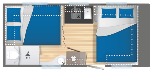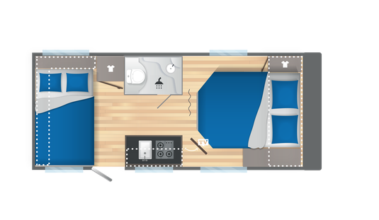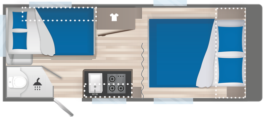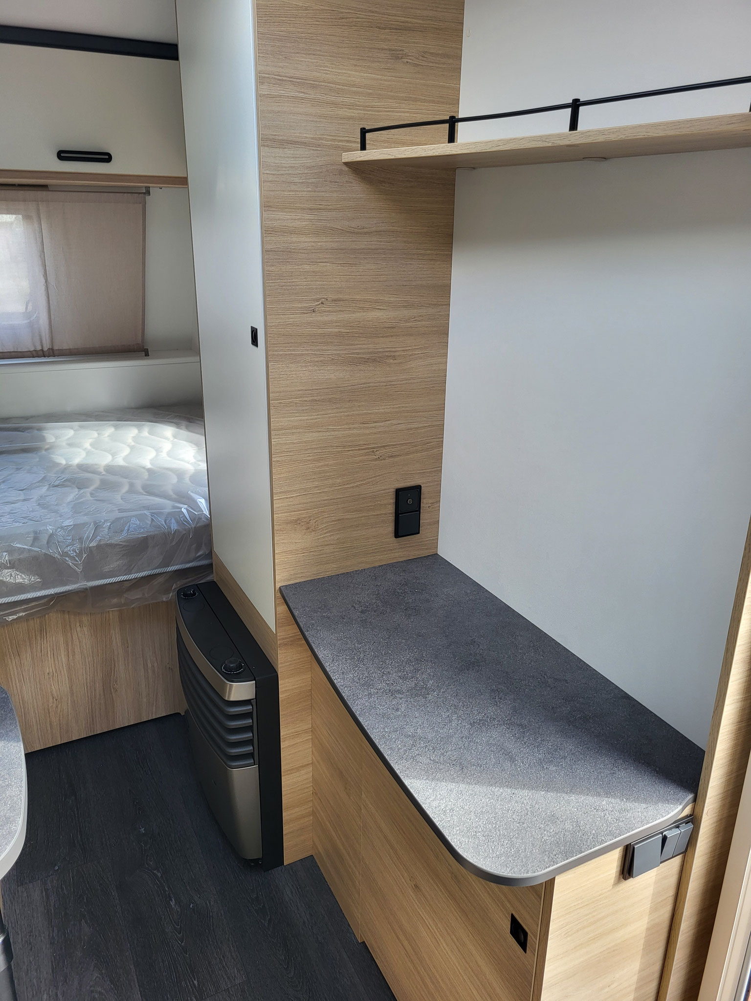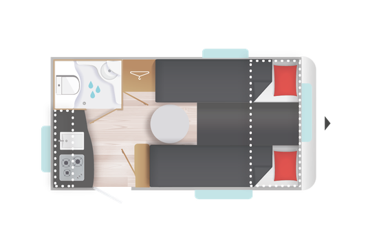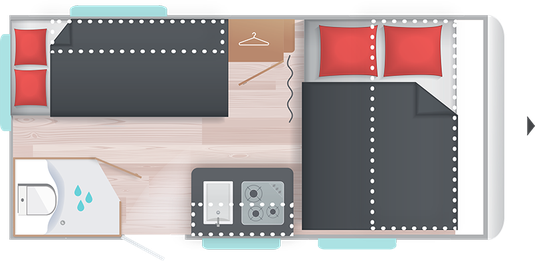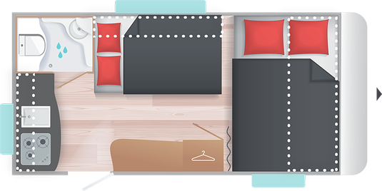Durch die ausgeklügelte Anordnung und die optimal unterteilten Wohnbereiche bietet Ihnen dieser Wohnwagen viel Bewegungsfreiheit. Ferner verfügt er über eine 1,20 m große Küchen-Arbeitsplatte, ein Festbett mit 2 Plätzen und eine in 2 Kinderbetten umwandelbare Essecke.
