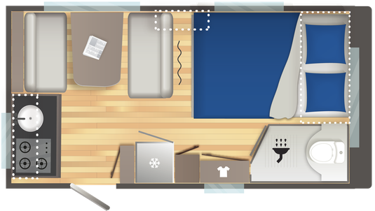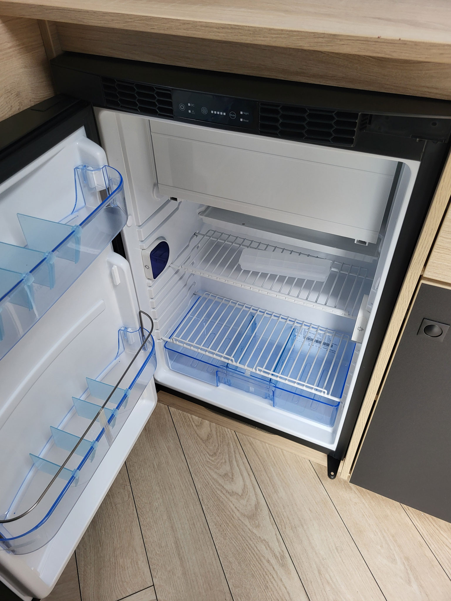 Zur Serienausstattung gehören ein 150 l Kühlschrank, eine Gasheizung über Warmluft und mehrere Ausstattungspakete.