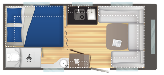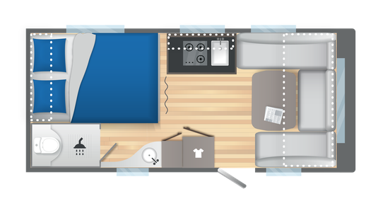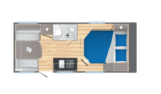 Komfortabler Wohnwagen mit einer Gesamtlänge von 5 m, mit einem leicht zugänglichen zentralen Bett und einem U-förmigen Wohnbereich, das sich