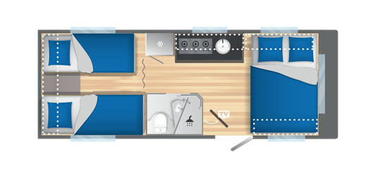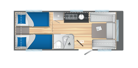 Genießen Sie mit dem ALBA einen leicht zu ziehenden Wohnwagen mit Einzelbetten. Die Einzelbetten können ohne großen Aufwand zum King-Size Bett umgebaut werden.