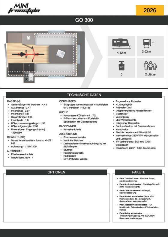 Mit ihrem Faltdach für leichteres Bewegen in Innenraum und ihren kompakten Abmessungen (Höhe und Breite 2 m / Länge 4 bis 5,18 m) besitzen die Mini Freestyle Niederflur-Wohnwagen viele Trümpfe. Ideal unter allen Bedingungen, besonders für Nomaden-Wohnwagenfahrer – man schätzt sie wegen ihrer Bewegungsfreiheit, Leichtigkeit beim Fahren, sparsamen Nutzung und dem funktionellen Volumen.